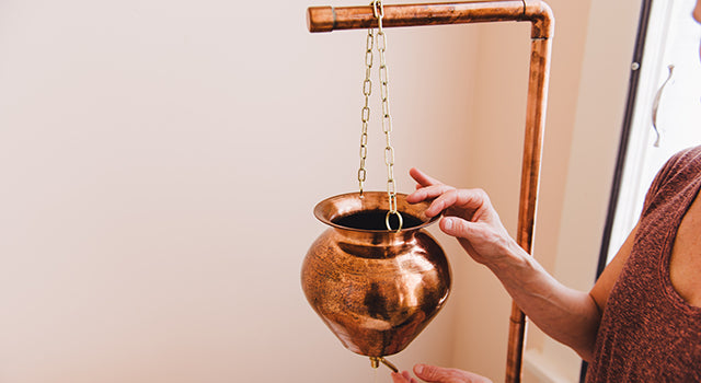 Shiro means “head,” and dhara means “dripping oil as if a thread.” Shirodhara as a treatment consists of a stream of warm oil run continuously on the forehead. Traditionally, the oil is run from a copper vessel held about six to eight inches above the forehead. Modern technicians sometimes use machines for shirodhara, but I don't recommend those as the electromagnetic energy interferes with the herbal oil and the healing process of the subtle body.