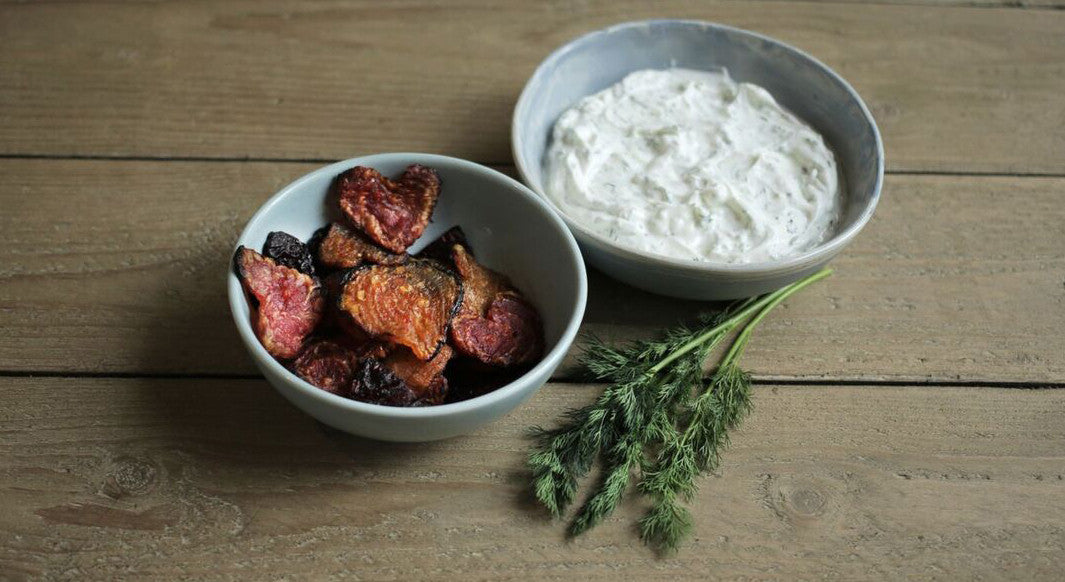 Place heart beets in a single layer on the baking sheet and bake for 10–15 minutes. Check for crispiness, turn beets, and continue to cook for another 10 minutes. If beets need more time, turn again and cook for another 5 minutes, or until done. Check often—at a certain point the chips can cook quickly. Thicker chips will take longer to cook. Serve with a creamy dip or eat alone.