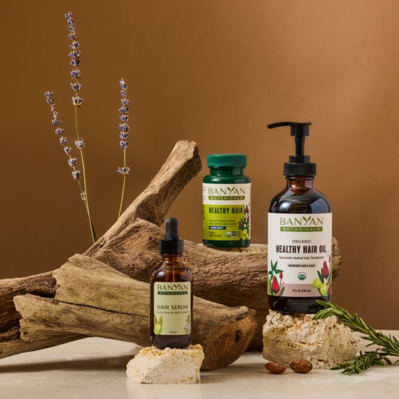 Healthy Hair Oil is a wonderful blend of sesame and coconut oils with some key herbs for healthy hair growth, like bhringaraj (known as “ruler of the hair”), amla, and gotu kola. These are all cooling and cleansing to pitta in the scalp, as well as calming and relaxing to the mind.