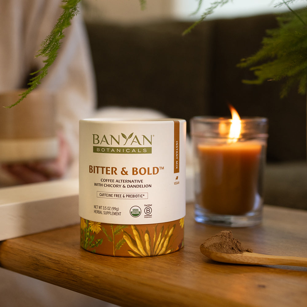 - Bitter & Bold is a roasty caffeine-free coffee alternative that supports a healthy gut microbiome and liver health with herbal adaptogens.*