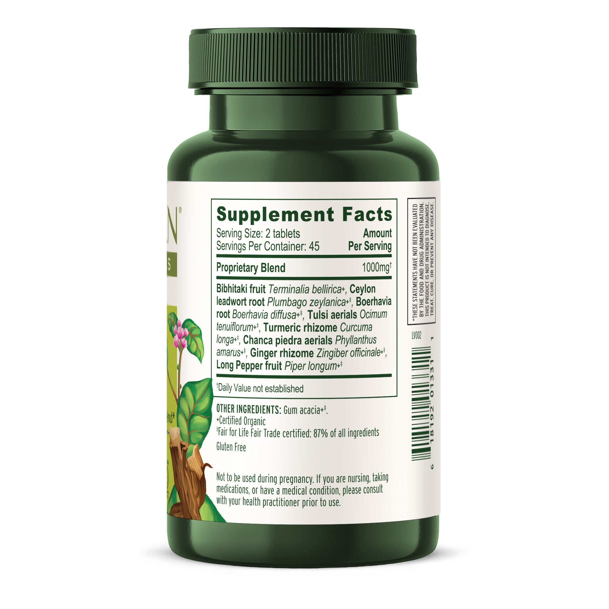 Ingredients (gluten free): Bibhitaki fruit (Terminalia bellirica)+, Chitrak (Ceylon leadwort) root (Plumbago zeylanica)+‡, Punarnava (Boerhavia) root (Boerhavia diffusa)+‡, Tulsi aerials (Ocimum tenuiflorum)+‡, Turmeric root (Curcuma longa)+‡, Bhumyamalaki (Chanca piedra) aerials (Phyllanthus amarus)+‡, Ginger rhizome (Zingiber officinale)+‡, Pippali (Long Pepper) fruit (Piper longum)+‡.