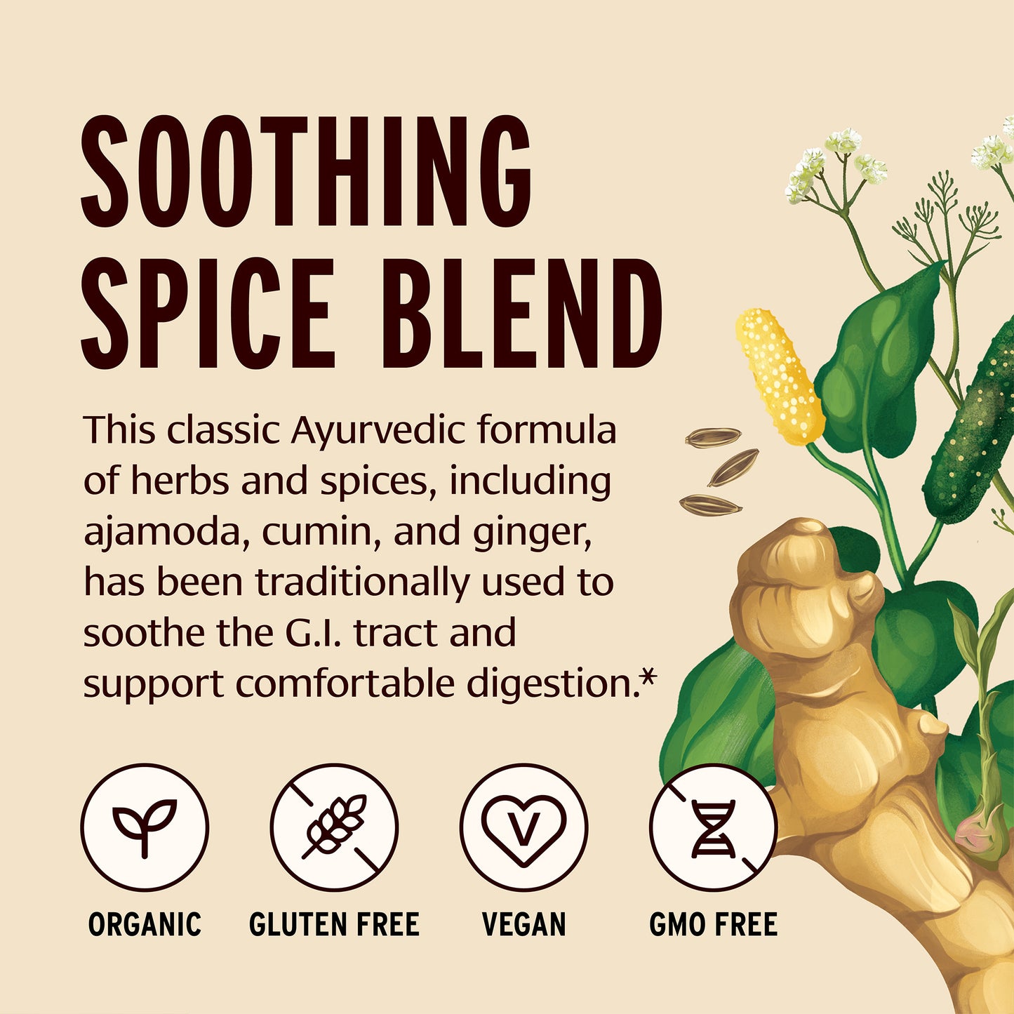 Vata brings the qualities of cold, light, and dry, and in excess, these qualities inhibit proper digestive function and create discomfort after eating, like gas, bloating, and hard stools. This classical Ayurvedic formula of herbs and spices, including ajamoda, cumin, and ginger, has been traditionally used to calm and balance vata while it warms and soothes digestion.*