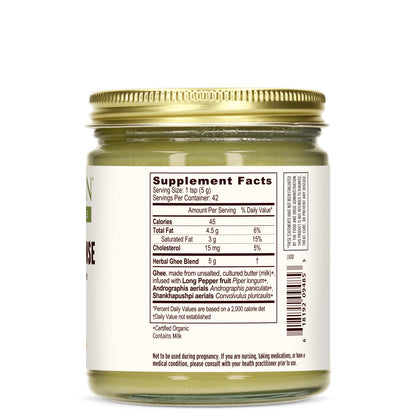 Ingredients: Ghee made from unsalted, cultured butter (milk)+, infused with Pippali (Long Pepper) fruit (Piper longum)+, Andrographis aerials (Andrographis paniculata)+, Shankhapushpi aerials (Convolvulus pluricaulis)+.