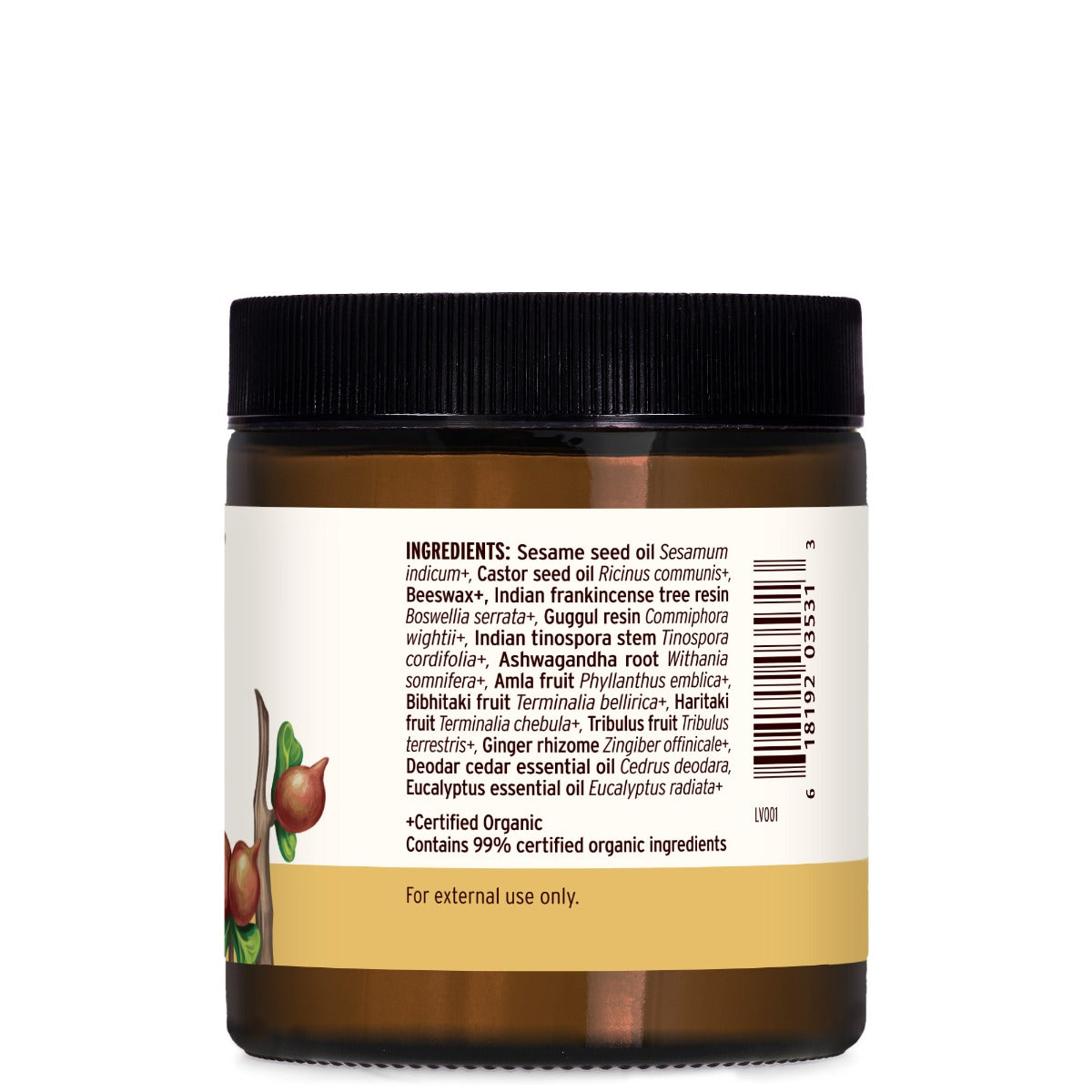 Sesame Oil (Sesamum indicum)+, Castor Oil (Ricinus communis)+, Beeswax+, Boswellia (Indian Frankincense tree) resin (Boswellia serrata)+, Guggulu (Guggul) resin (Commiphora wightii)+, Guduchi (Indian Tinospora) stem (Tinospora cordifolia)+, Ashwagandha root (Withania somnifera)+, Amla fruit (Phyllanthus emblica)+, Bibhitaki fruit (Terminalia bellirica)+, Haritaki fruit (Terminalia chebula)+, Gokshura (Tribulus) fruit (Tribulus terrestris)+, Ginger rhizome (Zingiber officinale)+, Deodar cedar essential oil (Cedrus deodara), Eucalyptus essential oil (Eucalyptus radiata)+.