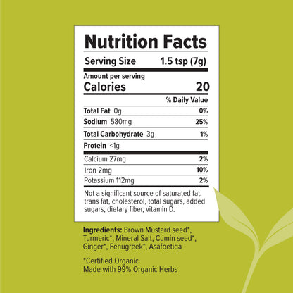 Brown Mustard seed+, Turmeric powder+, Natural Mineral salt, Cumin seed+, Ginger powder+, Fenugreek+, Asafoetida.