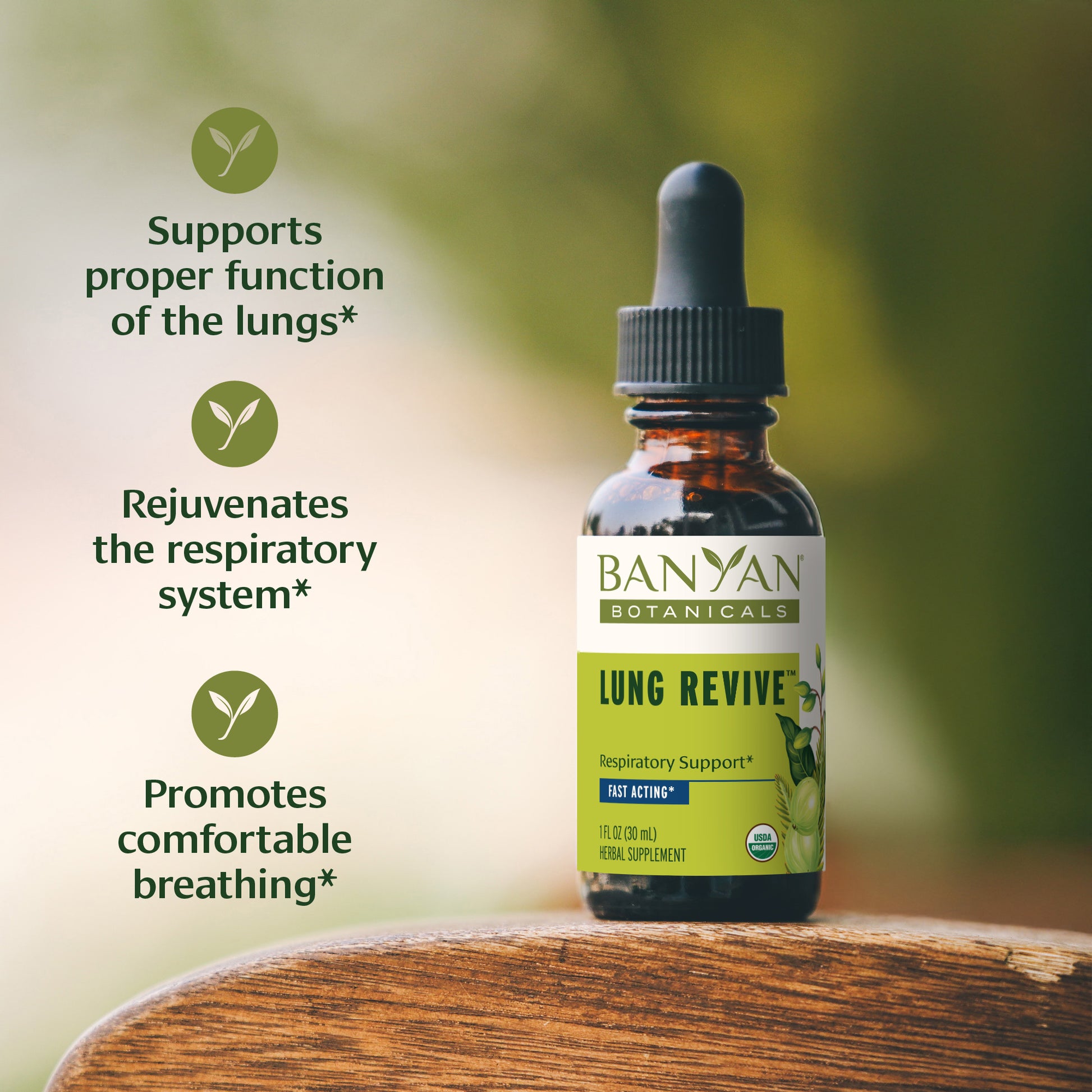Lung Revive is a simple yet powerful blend of five potent herbs traditionally used to support the lungs and respiratory system. As a liquid extract, this formula works to quickly open, soothe, and rejuvenate, supporting healthy, comfortable breathing in the process.*