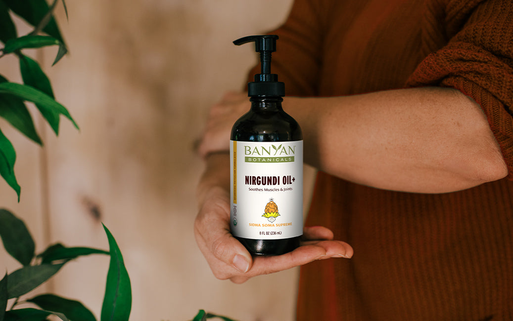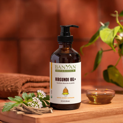 Along with supporting comfort and relaxation, Nirgundi Oil+ is renowned for its ability to promote sweating and support the elimination of natural toxins. Because of this quality, it is commonly recommended during an Ayurvedic cleanse to facilitate the body's natural detoxification process.