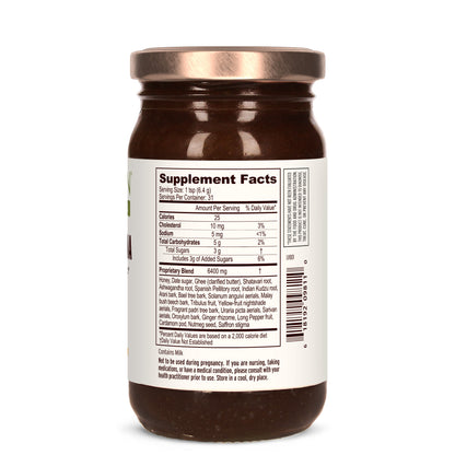 Honey, Date sugar, Ghee (clarified butter), Shatavari root, Ashwagandha root, Spanish Pellitory root, Indian Kudzu root, Arani bark, Bael tree bark, Solanum anguivi aerials, Malaybush beech bark, Tribulus fruit, Yellow-fruit nightshade aerials, Fragrant padri tree bark, Uraria picta aerials, Sarivan aerials, Oroxylum bark, Ginger rhizome, Long Pepper fruit, Cardamom pod, Nutmeg seed, Saffron stigma.