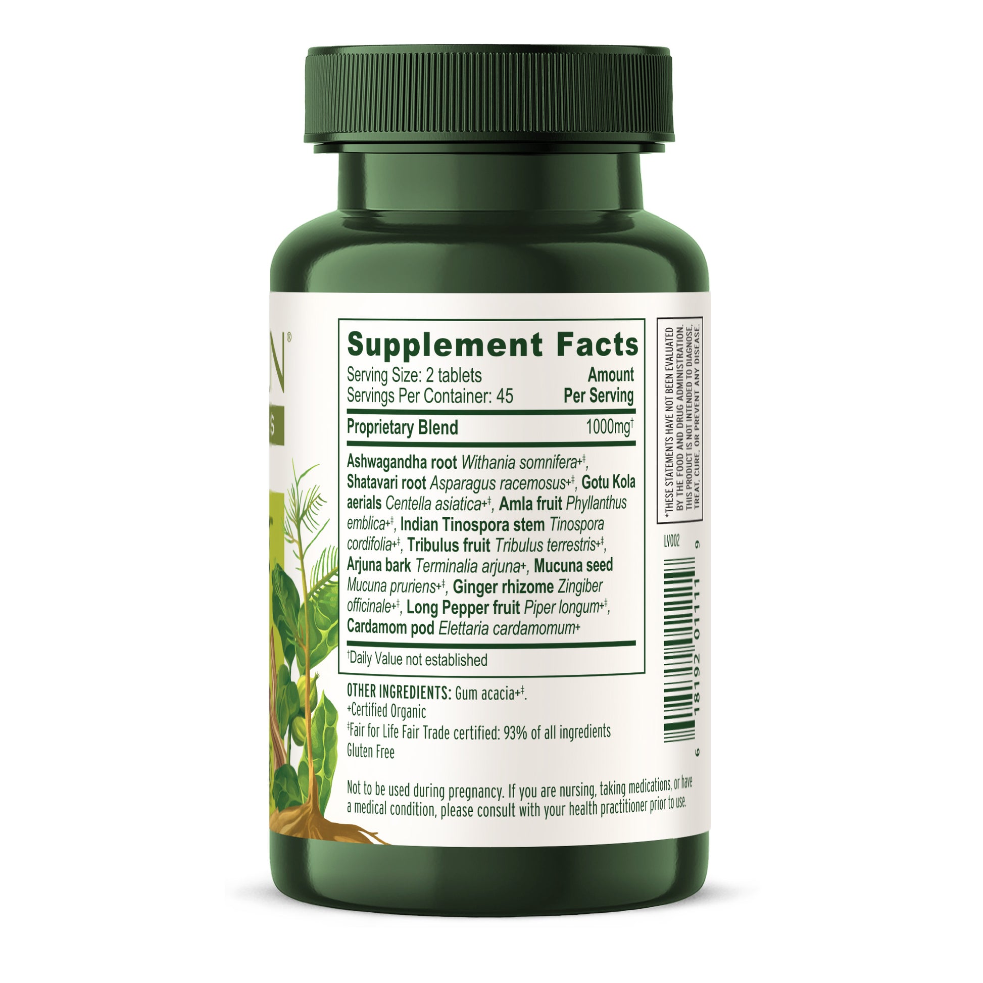 Each 500 mg tablet contains: Ashwagandha root (Withania somnifera)+‡, Shatavari root (Asparagus racemosus)+‡, Gotu Kola aerials (Centella asiatica)+‡, Amla fruit (Phyllanthus emblica)+‡, Guduchi (Indian Tinospora) stem (Tinospora cordifolia)+‡, Gokshura (Tribulus) fruit (Tribulus terrestris)+‡, Arjuna bark (Terminalia arjuna)+, Mucuna seed (Mucuna pruriens)+‡, Ginger rhizome (Zingiber officinale)+‡, Pippali (Long Pepper) fruit (Piper longum)+‡, Cardamom pod (Elettaria cardamomum)+.