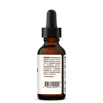 Refined Sesame seed oil (Sesamum indicum)+, Sunflower seed oil (Helianthus annuus)+, Eucalyptus essential oil (Eucalyptus globulus)+, Sandalwood essential oil (Santalum paniculatum)+, Ravintsara essential oil (Cinnamomum camphora)+, Rose Otto essential oil (Rosa x damascena).