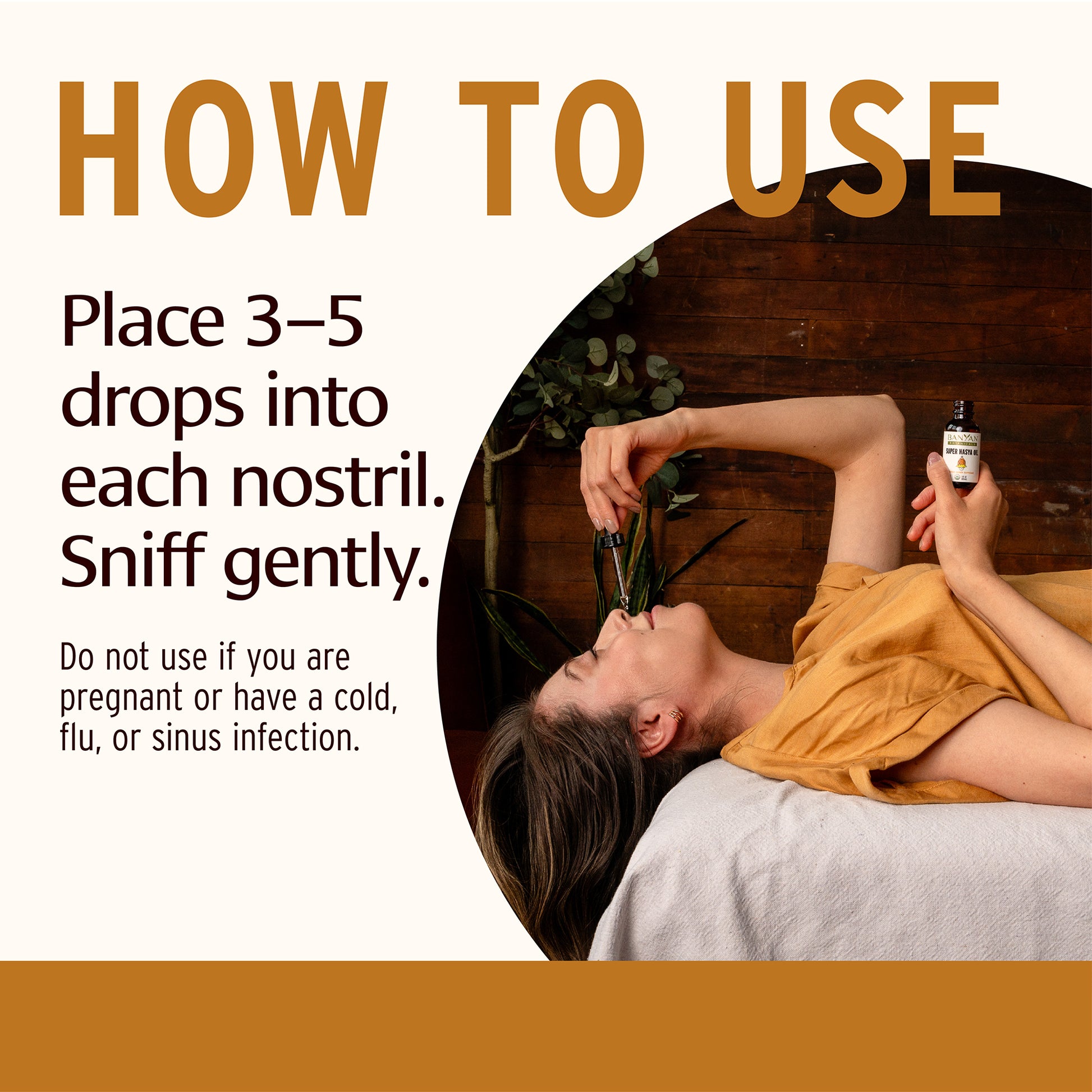 Tilt your head back gently and place 3 to 5 drops into each nostril. Sniff gently and deeply. This can be administered twice a day, or as directed by your health practitioner.