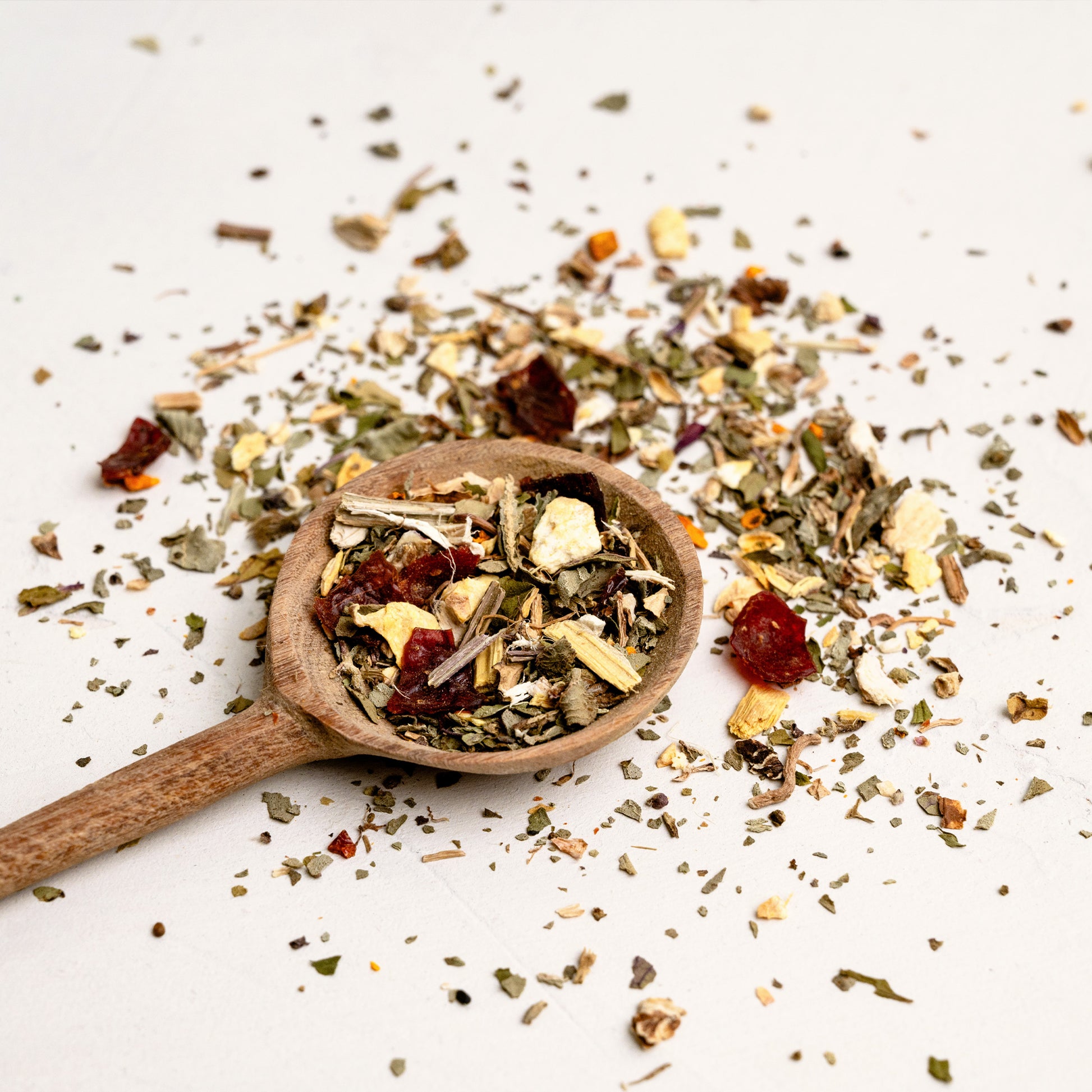 Kapoor Tulsi aerials (Ocimum x africanum)+, Echinacea root (Echinacea purpurea)+, Ginger rhizome (Zingiber officinale)+, Rosehip fruit (Rosa spp.)+, Turmeric rhizome (Curcuma longa)+, Marshmallow root (Althea officinalis)+, Mint aerials (Mentha spp.)+, Licorice root (Glycyrrhiza glabra)+.
