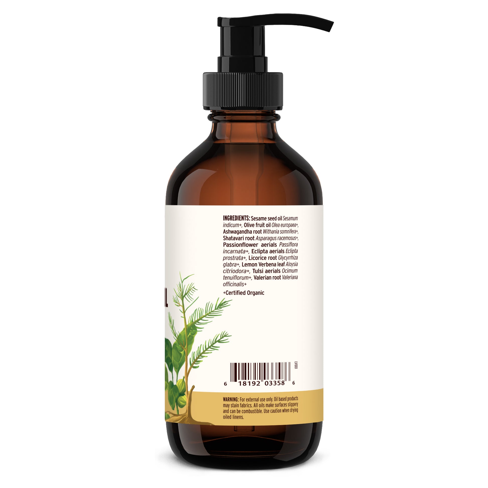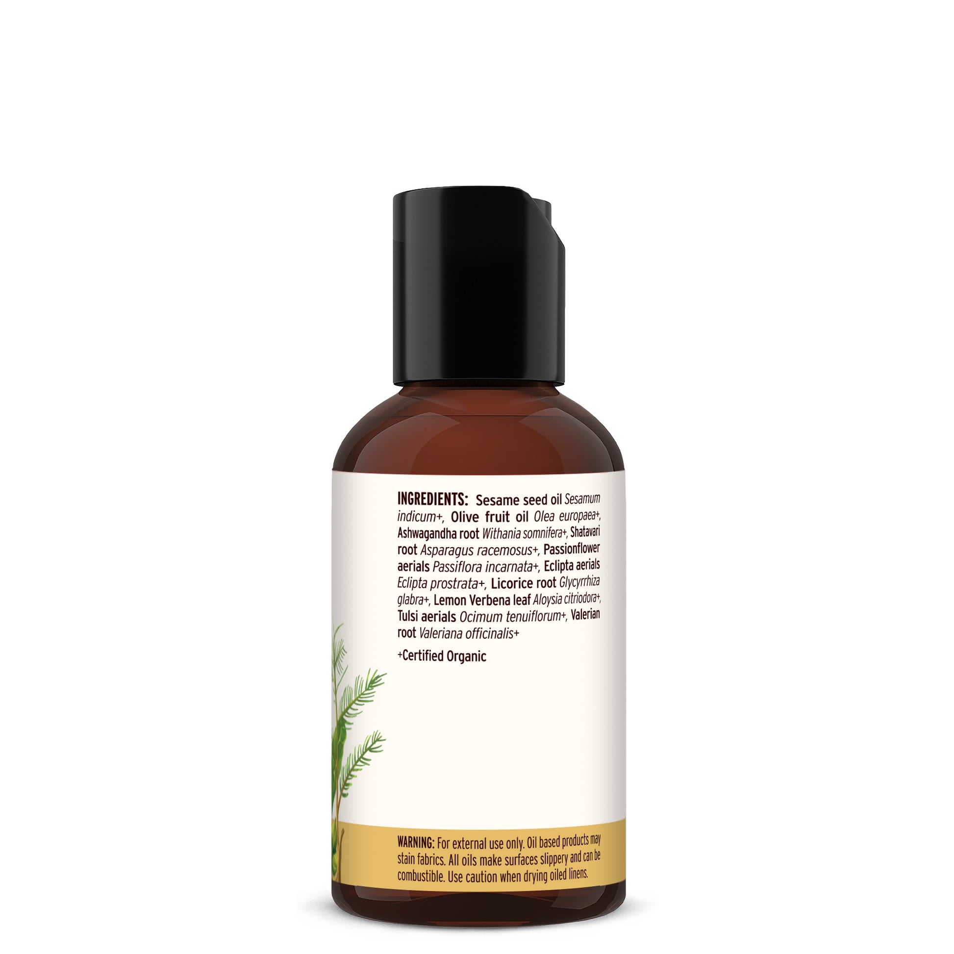Sesame seed oil (Sesamum indicum)+, Olive fruit oil (Olea europaea)+, Ashwagandha root (Withania somnifera)+, Shatavari root (Asparagus racemosus)+, Passionflower aerials (Passiflora incarnata)+, Bhringaraj (Eclipta) aerials (Eclipta prostrata)+, Licorice root (Glycyrrhiza glabra)+, Lemon Verbena leaf (Aloysia citriodara)+, Tulsi aerials (Ocimum tenuiflorum)+, Valerian root (Valeriana officinalis)+.