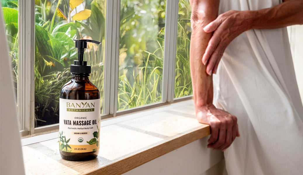 Vata dosha is predominantly composed of the elements of air and space and governs all motion in the body: swallowing, breathing, nerve impulses, muscle movements, and so on. Vata benefits greatly from all things slow and steady, especially a self massage with warm oil. The gentle pressure and firmness of massage balances vata and brings stability.